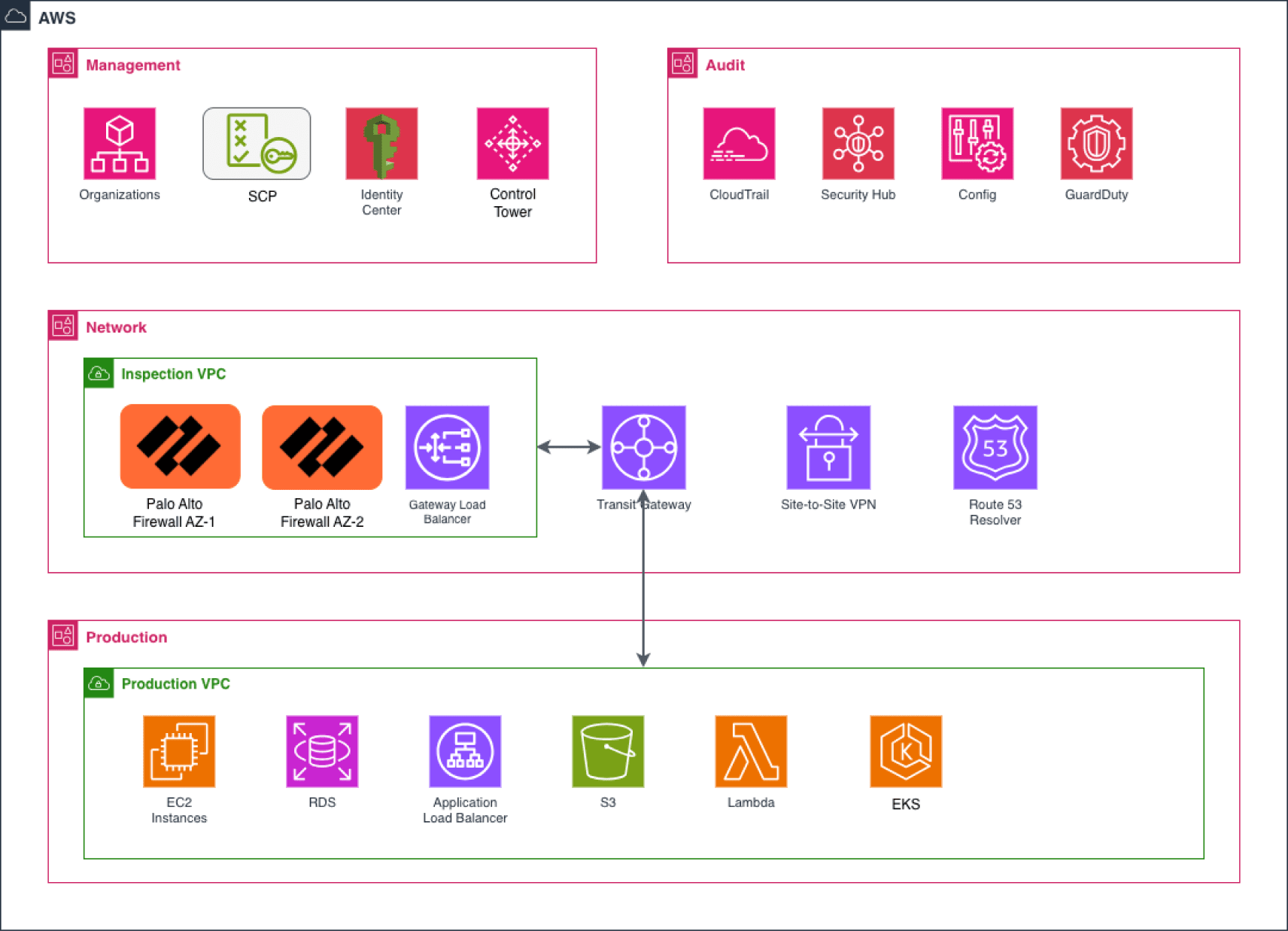 - Sicurezza della rete: ispezione centralizzata tramite Palo Alto Networks VM-Series Firewall integrato con AWS Transit Gateway per il controllo del traffico.
