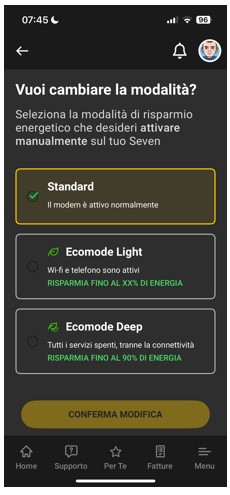 Selezionando Ecomode puoi impostare la modalità di risparmio energetico che desideri: