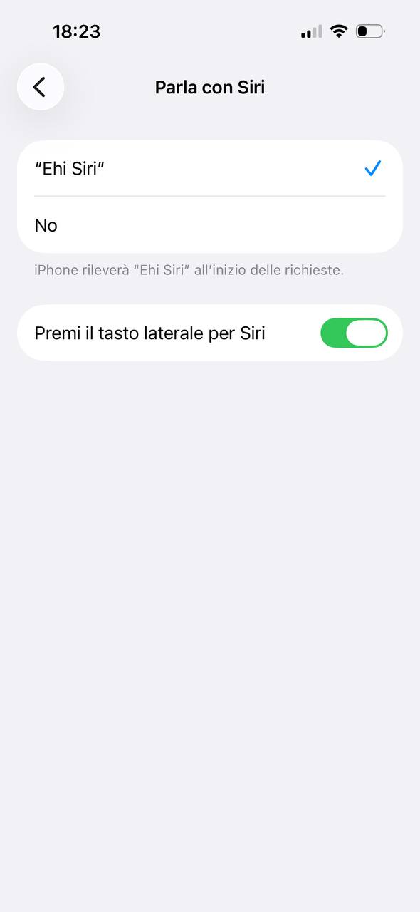 Scorrere la lista fino a individuare Siri e farvi tap sopra. Cliccare, poi, su Parla con Siri e scegliere l’impostazione No. La frase di attivazione dell’assistente vocale, Ehi Siri, non sarà più valida e non avrà più il potere di richiamare Siri.