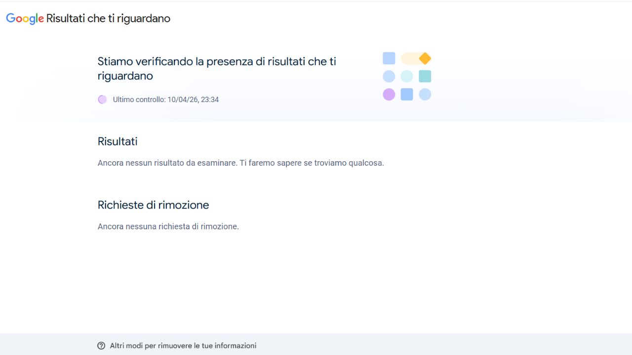 In questa sezione è possibile controllare in tempo reale se Google ha già indicizzato pagine web che contengono le informazioni di contatto o i documenti personali dell’utente che ne fa richiesta.