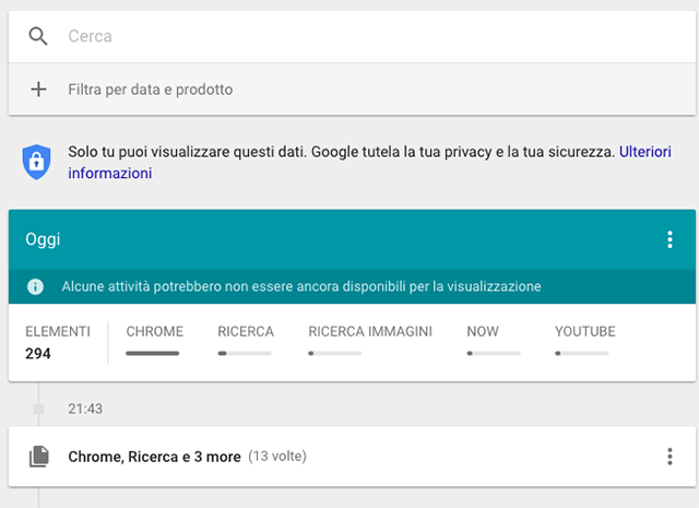 Grazie ai filtri, l'utente può decidere di affinare la ricerca per data e servizi utilizzati. Nel primo caso, si può decidere di restringere il campo a un periodo preciso (oggi, ieri, ultimi 7 giorni, ultimi 30 giorni), oppure personalizzare il tutto inserendo una data di inizio e una di fine. Sul versante dei prodotti, invece, si può decidere di non mettere alcun filtro (e lasciare selezionata l'opzione "Tutti i prodotti"), oppure scegliere uno o più dei servizi di Big G inseriti nell'elenco.