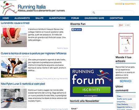 Sono sempre di più gli italiani che si appassionano alla corsa e, di conseguenza, cresce a vista d'occhio il numero di portali web dedicati al running. Spulciandoli sarà possibile trovare il miglior paio di scarpe da runner sia se si è ai primi passi (è proprio il caso di dirlo) oppure se si è un appassionato di corse da tempo; si potranno studiare piani alimentari che meglio si adattano al proprio allenamento di corsa e moltissimi altri consigli utili se si vuole curare un po' di più la forma fisica.