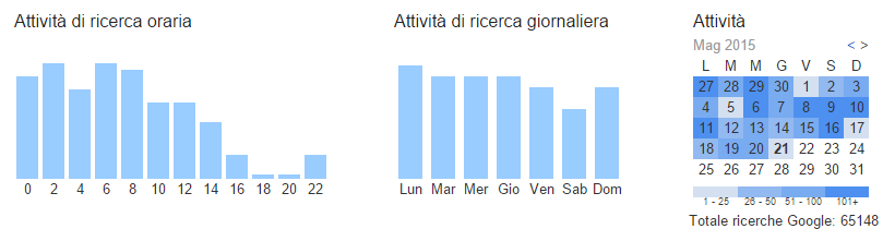 Come primo passo dovrete visitare la pagina web di Google dedicata alle attività svolte online e alle app. Questa pagina non è altro che la vostra “storia” sul sito di Google. Dopo che vi siete accreditati con le vostre credenziali dell’account Google (banalmene, nome utente e password utilizzati per accedere a Gmail, ad esempio) vi si aprirà un nuovo mondo. Statistiche, dati, informazioni: tutto ciò che avete fatto online negli ultimi cinque anni, raccolto in una pagina. Per gli amanti dei numeri e delle curiosità, la parte delle statistiche può regalare delle vere e proprie soddisfazioni. Infatti, spulciando i grafici, possiamo vedere in quale fascia oraria siamo più attivi, in quali giorni della settimana effettuiamo più ricerche e infine tramite il calendario, vedere giorno per giorno le nostre attività. Prendendo un giorno qualsiasi, si hanno tutte le attività svolto nelle 24 ore. Ad esempio potreste scoprire che a mezzogiorno del 15 aprile del 2014 siete andati alla ricerca di pizzerie a Milano, o che in qualche notte insonne avete visitato siti di video streaming.