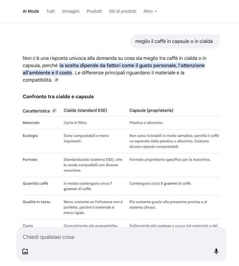 Dopo aver inserito la propria richiesta, premere Invio. Google apre automaticamente la sezione Tutti della ricerca. Per accedere alla ricerca con l’intelligenza artificiale, cliccare nella parte superiore della schermata su AI Mode.