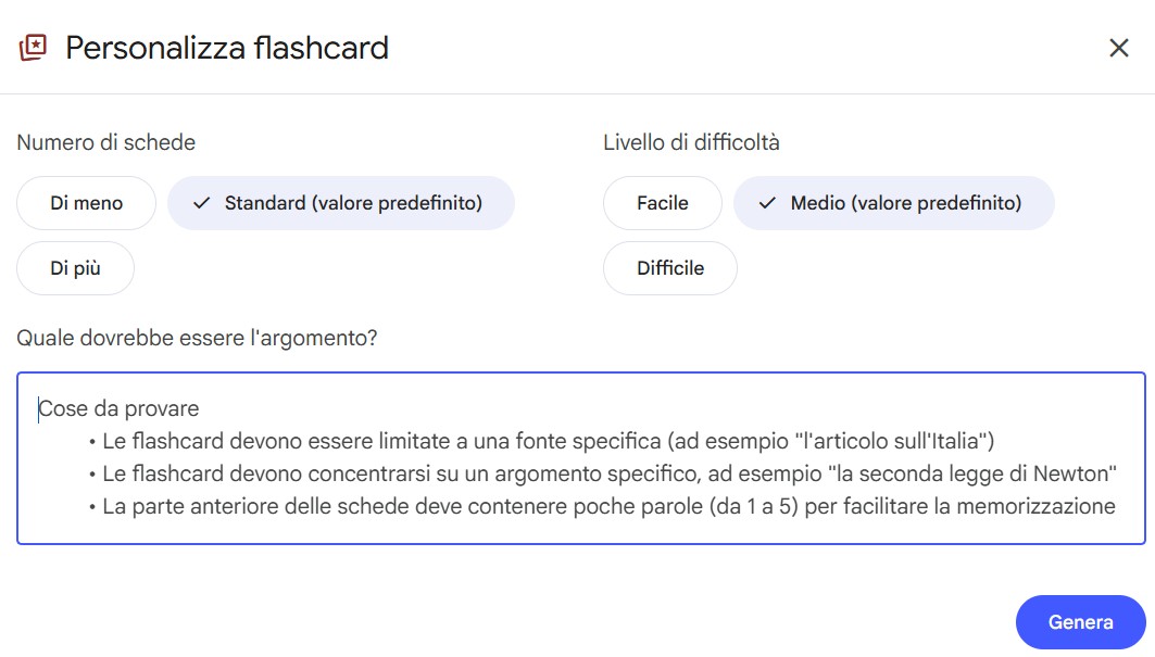 Quali sono le opzioni disponibili durante la generazione delle flashcard su NotebookLM?Puoi scegliere il numero di schede da visualizzare, il livello di difficoltà (Facile, Medio, Difficile) e fornire dettagli sull'argomento delle flashcard.
