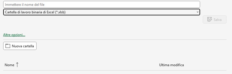 Per ridurre le dimensioni del file è utile salvare il documento in formato XLSB, ossia in formato binario. Per farlo, cliccare su Salva con nome e scegliere, tra i formati, Cartella di lavoro binaria di Excel.