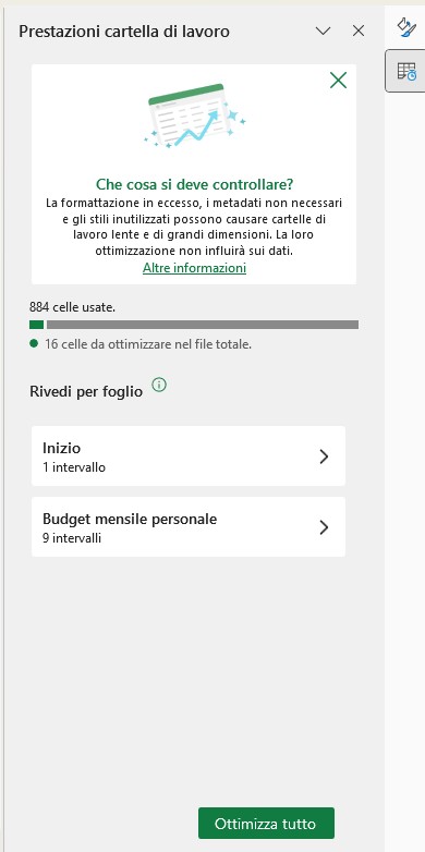 Chi possiede un abbonamento a Microsoft 365 può anche migliorare le prestazioni del file attraverso il menu Revisione. Qui occorre premere su Controlla prestazioni. Nella barra laterale verranno indicate informazioni preziose sul file, come il numero di celle da ottimizzare. Per migliorare il documento, cliccare su Ottimizza tutto.