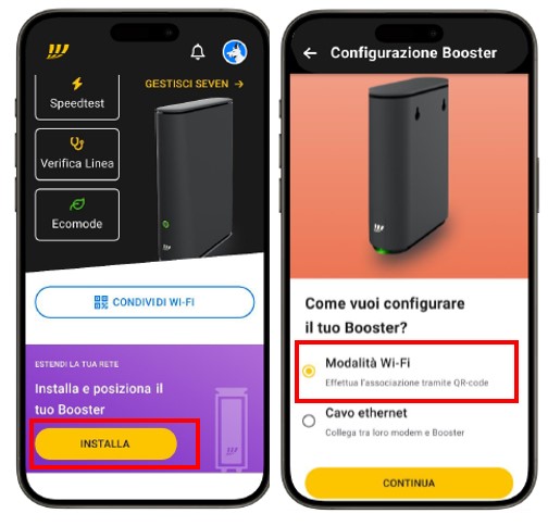 Una volta installato il modem Seven, nella Home page comparirà una card che ti guiderà nell’installazione del Booster