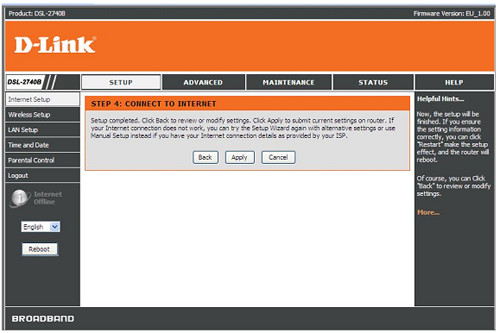 Clicca su Apply per confermare le configurazioni. Si presenta una pagina di riepilogo delle impostazioni avanzate ADSL, come quella di seguito riportata, sulla quale non è necessario effettuare nessuna modifica rispetto ai parametri preimpostati.
