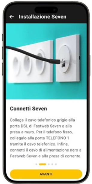 Collega il cavo di alimentazione nero del modem Seven direttamente alla presa di corrente (senza multiprese o ciabatte).